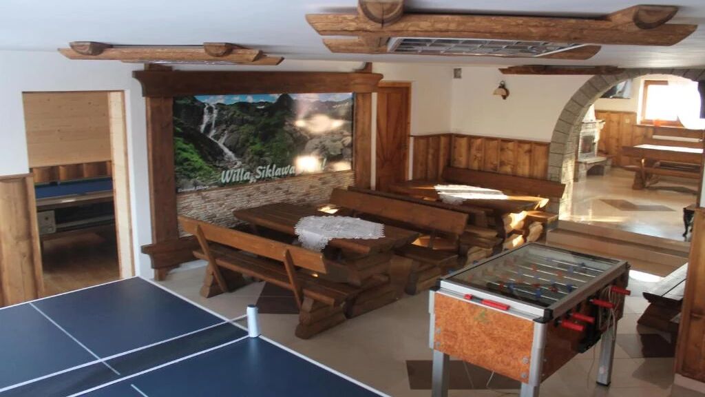 - w drugim budynku w odległości zaledwie 20 metrów: stołówka oraz sala z kominkiem, bilardem, stołem do ping-ponga oraz piłkarzykami - idealne miejsce do relaksu i integracji po dniu pełnym aktywności na stoku.